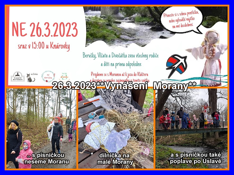 Na smrtnou neděli se v Nepomuku odnášela Morana – na této rodinné akci pro širokou veřejnost se společně přivolávalo jaro písničkami, jarními úkoly i tradicemi, které jsou s vynášením zimy spojené. Sice nám počasí moc nepřálo, ale nenechali jsme se odradit a i ti nejmenší hezky dozdobili Moranu, kterou vyrobily děti s maminkami z pionýrské skupiny Vlčata a po cestě k jezu do Kláštera děti nadšeně („déšť nedéšť“) plnily jarní úkoly. Malé Morany si měly šanci vyrobit všichni, kteří se zapojili do tvoření od lesního klubu Divočátka, Berušky zase připravily Morany „na zub“ ze sušeného ovoce. Největší zážitek ovšem přinesla sama Morana, když v proudu vody rychle uplavala a děti ji podél břehu vyprovázely jak se patří – kameny a klacky, aby ta zima skutečně odešla. Teplý čaj a domácí dobroty pak přišly vhod a smlsli si na nich jak malý, tak i velcí. Děkujeme za spolupráci všem, kteří se na akci podíleli, bylo to moc příjemné odpoledne!**KB