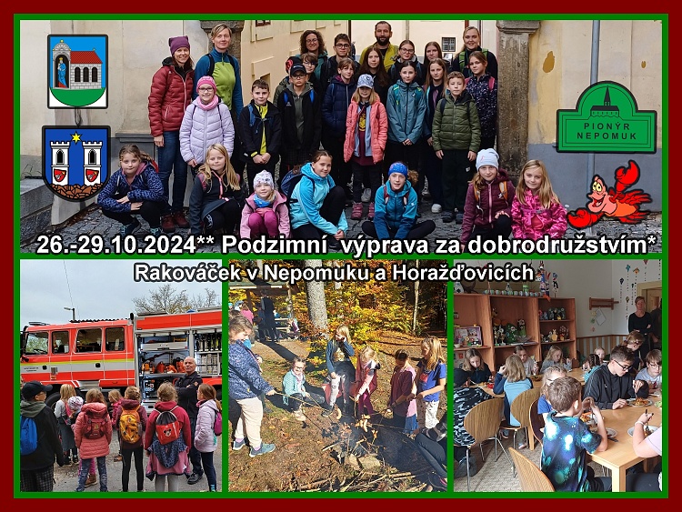 V termínu 26.10. - 29.10. jsem se vydali s oddílem na další podzimní výpravu, tentokrát na pionýrskou základnu do Nepomuku. Po příjezdu, ubytování a malé svačině jsme měli domluvenou prohlídku u HZS Nepomuk. Prohlídka se všem velmi líbila, dozvěděli jsme se spoustu nových zajímavostí ze života hasičů, mohli jsme si vyzkoušet náčiní, které hasiči využívají ke své práci. Provedli nás celým barákem, včetně posilovny. Prolezli jsme si auta a nakonec nám předvedli i cvičný poplach. Takže zážitky velké. Pak už návrat zpět na bydlení, děti tomu říkali hotel, kde jsme si zahráli nějaké hry a po večeři spát, jelikož nás čekal budíček o něco dříve než jsme zvyklý. V neděli jsme museli vstávat ještě za tmy, bylo potřeba stihnout snídani a včas odejít na vlak směr Horažďovice. V Horažďovicích jsme se vydali do aquaparku. Po dvouhodinovém řádění ve vodě všem pořádně vyhládlo, a tak jsme se vydali do blízké pizzerie. Když jsme přijeli zpět do Nepomuku, bylo zapotřebí utratit nějaké kapesné, tak jsme ještě navštívili místní prodejnu potravin. Po návratu z výletu byl na programu turnaj v Dobble, byl to napínavý souboj a užili jsme si spoustu legrace. V průběhu odpoledne ještě probíhalo hlasování, jaký animovaný film si pustíme po večeři. Po večerním kinu už se nic nedělo, následovala večerka. V pondělí jsme se vzbudili do slunečného rána, to jsme měli radost, protože jsme se chtěli pěšky vydat ke zřícenině Potštejn. Takže snídaně, zabalit svačiny a hurá batohy na záda a ven. Kousek cesty jsme šli po naučné stezce Klejnot, po které byly umístěné zajímavé informační cedule s úkoly a vyřezávané sochy zvířat. Škoda, že jsme s sebou nevzali kostky a figurky, protože v přístřešcích byly umístěné i deskové hry. Sluníčko nás hřálo celý den. V cíli jsme obhlédli zbylé zdi zříceniny a vydali jsme se hledat místo k rozdělání ohně. Opekli jsme si párky, trochu poseděli, abychom nabrali síly na zpáteční cestu. Odpoledne, když jsme se vrátili, dali jsme si polévku a chvilku na odpočinek, tak jsem se pak vrhli na rukodělky. Menší děti vyráběli a pro starší jsme si připravili překvapení. Rozdělili jsme je na dva týmy a dostali stejný úkol - zašifrovanou Halloweenskou detektivku, kdy museli přijít na to, kdo je vrahem. Oba týmy si s šiframi celkem dobře poradili, občas byla nutná malá nápověda, ale nakonec případ úspěšně vyřešili. Po večeři jsme pro děti připravili ještě malou stezku odvahy na půdě, kde byly rozmístěné a osvětlené kulisy místních oddílů. Někteří se báli více, někteří méně, ale všichni stezku úspěšně zvládli. V úterý byl poslední den naší výpravy. Dopoledne jsme dodělávali výrobky z předešlého dne, dívali jsme se na pohádky a instruktoři pak dětem zahráli loutkové divadlo. Po obědě už jen zbývalo sbalit si věci, uklidit a vydat se na vlak. V Rokycanech na nádraží už čekali nedočkaví rodiče. Výlet se nám vydařil, všem se líbilo a my už vymýšlíme co zažijeme příště. Takže zase na nějaké další výpravě na viděnou.**MarkétaV.