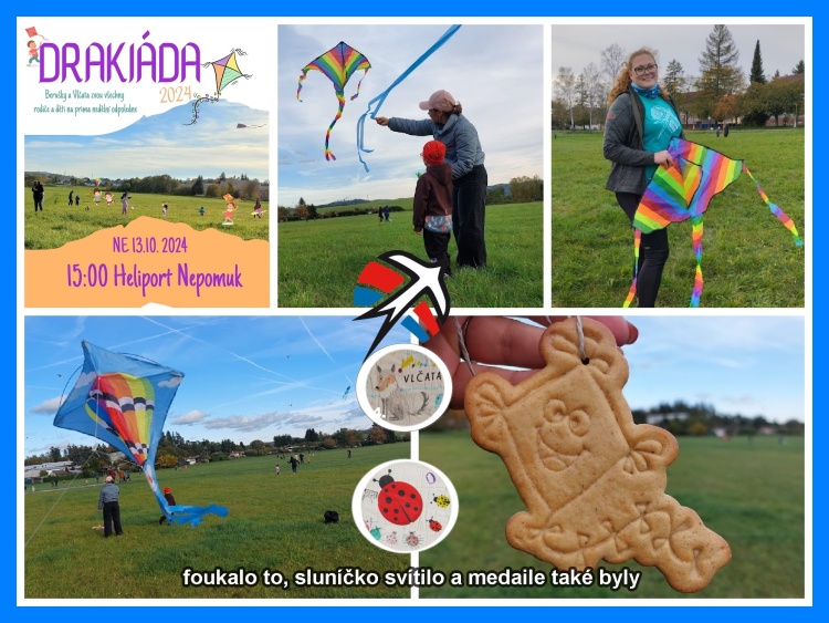 Drakiáda, na kterou se skutečně velmi povedlo počasí, proběhla v neděli 13.10.2024 na louce u heliportu v Nepomuku. Účastníci, kterým se povedlo dostat draka na oblouhu byli odměněni perníkovou medailí ve tvaru dráčka domácí výroby. Využili jsme i tradičně plochu heliportu, pokreslili ji křídami na různé pohybové hry a protože krásně svítilo sluníčko a foukal vítr, měli jsme o zábavu postaráno až do setmění. Nedělní odpoledne na čerstvém vzduchu společně s námi strávili celé rodiny - to nás vždy velmi potěší a inspiruje k další akci. Připravila Vlčata a Beruška.