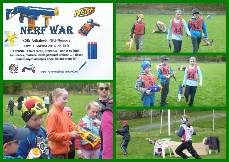 Každý prožívá SVÁTEK PRÁCE jinak. V Neurazech jsme 1.5. 2016 uspořádali 3. NERF BITVU. Účast opět veliká – spousta bojovníků a bojovnic, nádherná sbírka zbraní a dokonalá příprava některých účastníků.Pravidla si držíme přibližně stejná – každý jednu zbraň a max. 10 nábojů. Dvě zdravotnice, které vrací život, překážky na hřišti a dva týmy, které se snaží ukořistit vlajku soupeře. Stihli jsme 4 hry a 2x jednu novinku deathmatch. Myslím, že 22 bojovníků a 8 pomocníků si to hezky užili a bylo fajn, že děti opustily virtuální realitu a vstoupily na chvíli do skutečné. Každý účastník dostal krabičku KPZ, posbíraly se náboje, uklidilo se fotbalové hřiště a hurá domů. Tak zase příště v Neurazech. Chystáme se k pramenům Úslavy. Ahoj Marie Svejkovská