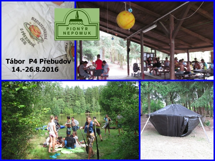 Tak už je to tady.... 14. srpen 2016 se přiblížil a to bylo datum našeho příjezdu na tábor Přebudov. Dospěláci i malý táborníci byli nedočkaví a natěšení, čekající nové kamarády a dobrodružství. Po příjezdu všech táborníků jsme si prošli tábor a zjistili vše důležité – co kde a jak.... V rámci seznamování jsme si došli do lesa na dříví, abychom mohli večer opéct buřty k večeři. Po svačině nám Majda – naše hlavní vedoucí představila zbytek osazenstva a přečetla táborový řád a režim dne. Na nástupu jsme se dozvěděli, že celotáborová hra začne po setmění. Když už bylo hodně velké šero, začala na hřišti svítit a blikat kosmická loď a to byla známka toho, že se začíná něco dít. Majda nám oznámila, že musíme začít vyvolávat mimozemšťana, který nás bude celých 14 dnů pobytu provázet. A v tom se to stalo..... Z kosmické lodě vystoupil mimozemšťan Ťa Fun z planety Fudža fuč a představil nám celotáborovou hru. Poté nás požádal, abychom šli do lesa najít světla, která spadla z mimozemské lodě, když v Přebudově přistávala, kde bude napsán vzkaz, co se bude dít dál. A opravdu – vzkaz tam byl. . . Ráno jsme vyskočili z postelí, plni elánu, protože jsme věděli, co nás čeká. Prvním úkolem bylo, nabatikovat si trička a nažehlit logo letošního tábora. Odpoledne nás navštívil opět mimozemšťan Ťa Fun a vyprávěl nám o planetě Merkur a už pro nás připravil první úkoly – jízda s kárkou, chůze na novinách apod., abychom věděli, jak se na takové planetě pohybuje. V úterý, hned po snídani, nám mimozemšťan představil planetu Venuši a s tím opět další úkoly jako stavění stanu , střelba ze vzduchovky..... Odpoledne přijel pan fotograf, aby zvěčnil naše krásná trička a měli jsme všichni památku na tábor. Večer jsme si užili diskotéku pod taktovkou Bláži a Mušáka.... a srandovní soutěže pod taktovkou Kikiny a Dáni. Museli jsme jít spát za včasu, protože ve středu nás čekal výlet do Nepomuka do zábavného parku. Vybaveni svačinkou jsme si to po ránu štrádovali k Přebudovu, kde na nás čekal autobus. Moc jsme si to užili a po poledni zvládli navštívit ještě Nepomuk – někteří nákupy, někteří zmrzlinu, jiní dětské hřiště v Zeleném dole. Čtvrtek byl opět s mimozemšťanem a vyráželi jsme pro změnu na Mars. A protože Mars je rudá planeta, hned ráno si všichni oblékli červená trička a šli soutěžit. Po soutěžení jsme ještě prošli stanoviště, kde nám vedoucí vysvětlili, jak se používá morseovka, uzly, buzola, paní zdravotnice si nás vyzkoušela, co víme ze zdravovědy a hádali jsme kytky a stromy. Protože se na nás i letos usmálo sluníčko a počasí přálo, zkusili jsme po poledním klidu i koupání v rybníku, který je hned pod táborem. Po svačině k nám přijel pan Honzík z Hvězdárny z Plzně, který nám vyprávěl o sluníčku, mohli jsme se podívat ohromným dalekohledem a ptát se ho na to, co nás zajímalo. Pak jsme se přesunuli do slepičárny, kde udělal všeobecnou besedu o planetách a o nebi, co vše tam můžeme vidět. Večer, když už byla velká tma, šli velké oddíly pozorovat i noční oblohu. Bylo to velice zajímavé, i když pan Honzík říkal, že to není nic moc, že je úplněk.... Ale nám to vůbec nevadilo, vidět v dalekohledu měsíc v úplňku a krásný Saturn byl velký zážitek. V pátek dopoledne jsme si zahráli hru pro všechny „Šnek“. Odpoledne jsme se koupali a užívali si hezkého počasí. Na sobotu si pro nás vedoucí připravili Přírodovědnou stezku na Saturnu, aby zjistili, co si za týden pamatujeme z morseovky, uzlů, topografických značek, zvířat, rostlin, zdravovědy....  V denním programu bylo na odpoledne naplánováno překvapení, takže všichni napnutí co bude, jsme se nemohli dočkat. Vedoucí nás dovedli k rybníku a v tom na druhém břehu rybníka k nám na voru začal plout Neptun – vládce potoků, řek a studánek se svým černochem a vílami. Přijel si na náš tábor vybrat do své družiny nové členy. Ty, kteří ještě nebyli na našem táboře.       V neděli si s námi počasí trochu pohrálo, takže jsme museli Přebudovského predátora přesunout na odpoledne a dopoledne si zahrát naše oblíbené Bingo. Samozřejmě několik kol, aby si to užili všichni. Na večer jsme si domluvili promítání, které už nám dost chybělo. :-) V pondělí po snídani jsme si nabalili kotlíky, brambory, cibuli a chleba a vyrazili si do lesa uvařit polévku. Všem se povedla a moc si pochutnali. Po poledním klidu přijel pan Šipla z Blovic a mohli jsme si pro maminku vyrobit svíčku. V úterý se nám zjevil zase mimozemšťan Ťa Fun a představil nám planetu Neptun a dal nám úkoly na dopoledne – zahráli jsme si kuličkiádu. Odpoledne byla koupačka v rybníku a po svačině přijeli dobrovolní hašiči z Nepomuka a udělali nám pěnu, ve které jsme si pěkně zařádili. Středa se nesla na planetě Uran – opět jsme soutěžili na diplomy a odpoledne jsme nacvičovali představení na závěrečnou ufopárty, která měla být ve čtvrtek. Ve čtvrtek jsme doladili naše vystoupení, po polévce jsme se zaběhli svlažit do rybníka a po poledním klidu nás čekal poslední nástup. Majda s Markétou se s námi rozloučili, vyhodnotili, jak jsme si uklízeli ve stanech a v chatičkách, popřáli dvou kamarádům, kteří měli narozeniny a jako poslední přišlo na řadu vyhodnotit, jak jsme byli úspěšný v celotáborové hře. Všechny planetky, kde jsme 14 dnů trávili prázdniny, byli úspěšné – Ufofufo, Ufofialky z Ufofilie, Ufíci, Mrňouskova planeta, Winers i Vousáči. Postupně, jak jsme se umístili, jsme si chodili vybírat odměny. Po svačině už začala naše ufopárty. I vedoucí s