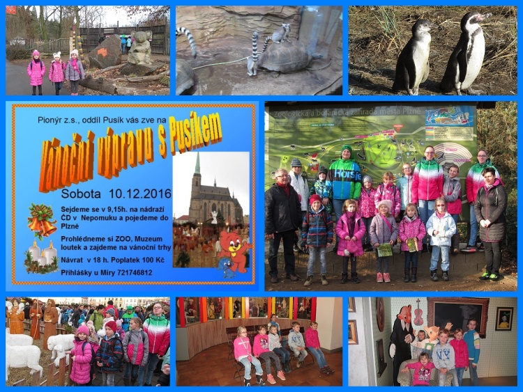 Do Plzně na naši vánoční výpravu se nás vypravilo devatenáct. Čtrnáct dětí a pět dospělých. Počasí nebylo vánoční, ale spíš velikonoční. Svezli jsme se rychlíkem a pak tramvají. K zoologické zahradě už pěšky. Prohlédli jsme si většinu pavilonů a nejvíc se líbili lemuři, želvy, šelmy a vydrýsek. Pěšky jsme došli okolo Kalikova mlýna na náměstí. Shlédli jsme výstavku Plzeňský betlém v radnici města. Prošli jsme vánoční trh okolo kolotoče, stromečku a dřevěného betlému. Prohlédli jsme si muzeum loutek na náměstí, vyzkoušeli maňásky a marionety. Vyfotili jsme u Špejbla a Hurvínka. Pak už nás čekala cesta osvětlenou Plzní a vlakem domů.*MD