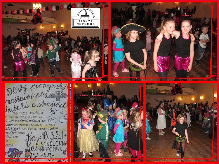 Dne 18. 3. 2017 se uskutečnil v nepomucké Sokolovně Pionýrský ples bubáků a strašidel pro děti. Sešlo se skutečně spoustu lidí; odhadem asi 65 dětí + organizátoři s rodiči. Na tomto maškarním plese se hlavně tančilo, ale byl zde samozřejmě i doprovodný program v podobě různých táborových her. Děti si tedy například mohly zaházet s kroužky, projít se s míčkem na lžíci po sále a tak dále a tak dále. Zatancovaly si také taneční sestavy, které děti naučila Karol Strychová, jež měla celý tento ples pod palcem stejně jako v roce minulém. I ty se dětem moc zalíbily. Závěrem bychom chtěli poděkovat všem, kteří se jakkoli podíleli na tomto plese, jmenovitě taneční skupině Skandál, která zde měla vystoupení, dále například Johance Sýkorové a hlavně Karolíně Strychové. Doufáme, že se opět uvidíme příští rok a že nás bude ještě o něco málo více. *Jarda Brejcha
