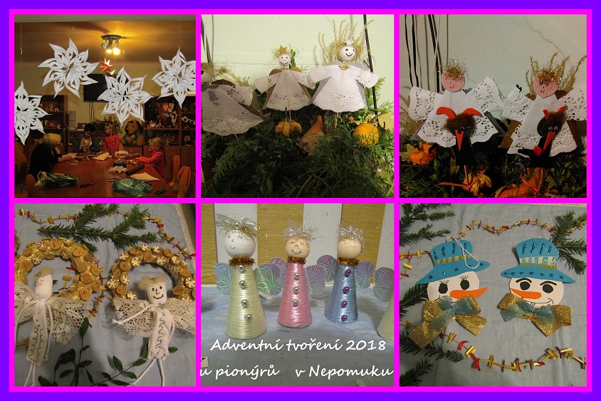 Pionýrské oddíly Pusík a Knoflíci zahájily adventní tvoření na svých schůzkách již od 26.11.2018. Vytvořené zápichy, věnce byly určeny pro výzdobu jejich pokojíčků, ale také jako součást naší vánoční výstavky. Výstavka byla k vidění na naší Mikulášské akci Nebe,peklo, pohádková půda, kterou děti zajistily na naší pionýrské klubovně pro své kamarády, známé. Vyzdobené místnosti kluboven a dvorku byly plné malých čertíků, v nebíčku nechyběl Mikuláš a andílci. Nasvícená pohádková půda se soutěžemi o cukrovíčka s vodníkem, Sněhurkou a čarodějnicí lákala všechny děti. Odměnou za básničku byl dáreček od Mikuláše, ale také čertovský párek v rohlíku a dárečky od pionýrů.Před svátky připravujeme ještě přespání na klubovně s připomenutím vánočních tradic, budeme opět tvořit a nebude chybět diskotéka v bílém.
