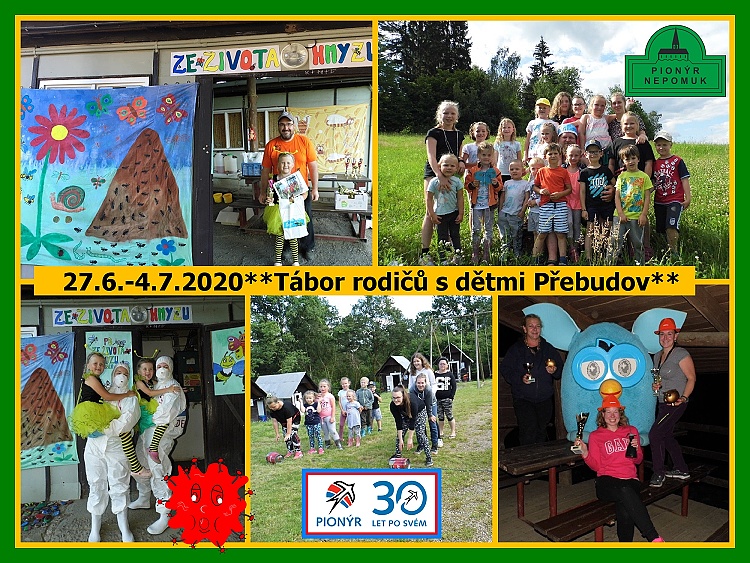 Od 28.6 do 4.7.2020 se na Táborové základně Pionýrské skupiny Nepomuk v Přebudově, uskutečnil první letošní tábor.Táborový klub P0 připravil tábor pro rodiče s dětmi na téma: Ze života hmyzu. Celý týden jsme si hráli a bavili se. Měli jsme spoustu her na hřišti. Hledali jsme poklad, stavěli domečky pro zvířátka, pořádali výpravy. Měli jsme táborák, buřty, písničky s kytarou. Sříleli jsme z luku, měli mravenčí disko, nechyběl bar, sáňkování, lyžování, padák a další hry.Každý den jsme něco vyráběli: Motýlky, berušky, vymalovali jsme hmyz na chatky, malovali na kameny a nechybělo ani batikování triček podle týmů. Vše bylo moc fajn a už se těšíme na další tábor. Moc děkujeme Petře Belancové, která nás zachránila a jezdila nám vařit. Bylo to úža.