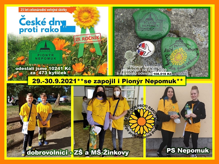 Do charitativní akce České dny proti rakovině se zapojili pionýři z Nepomuku a děti ze ZŠ/MŠ Žinkovy. V 25.ročníku této akce ve dnech 29.-30.9.2021 jsme prodali 473 kytiček a odeslali 10 241 Kč. V této akci jsme zapojeni od roku 2009 a na konto jsme vložili celekem 108.219 Kč, Děkujeme všem,kteří zakoupili kytičku pro dobrou věc a našim organizítorům.