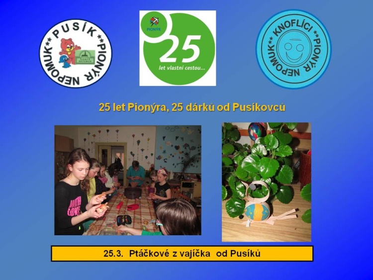 Naše dětská organizace Pionýr připravuje a organizuje volný čas dětem a dospělákům v malém městečku jižně od Plzně.