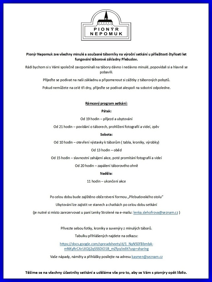 Pionýrská skupina Nepomuk připravila pro léto 2025 šest táborových běhů, tábor rodičů s dětmi a tři příměstské tábory.. O přihlášky na tábory si můžete napsat nebo zavolat na kontakty uvedené v letáčku. img